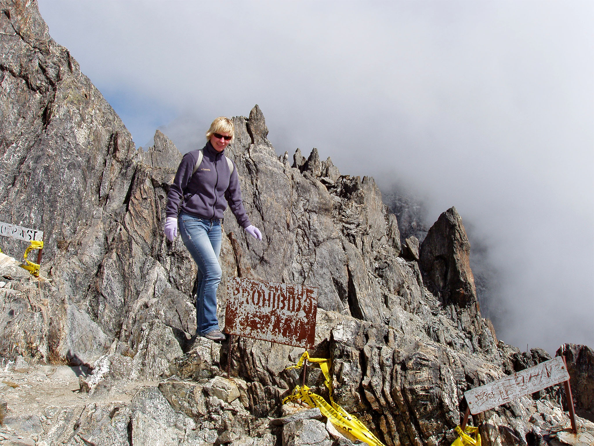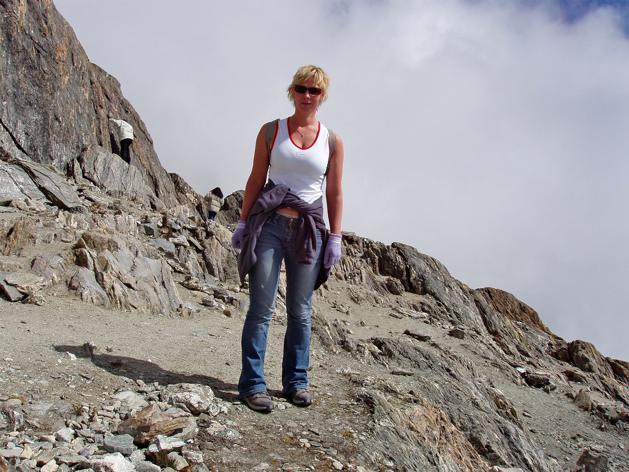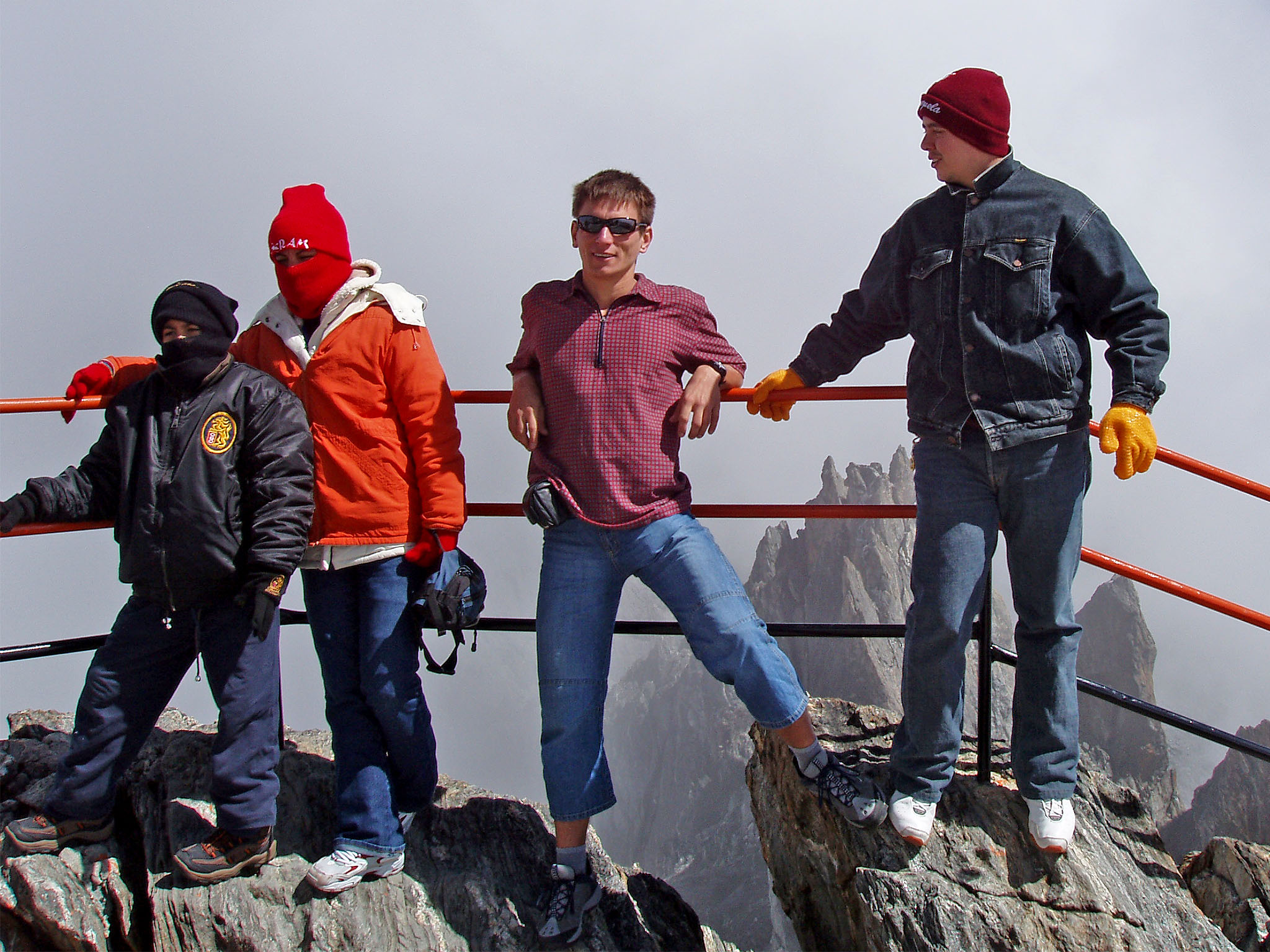 [maare] Noh, kinnaste ostmine oli põhjustatud muidugi sellest, et teleférico järjekorras seisid kõik, kaenlas sulejoped, peas mütsid, sallid ja muud külmaks ilmaks varutud soojad riided. Mõnel olid isegi sellised maskid peas, nagu meie suusamäel kanname. Pärast, kui selgus, et meie jaoks üleval üldse külm ei olnud, lasi Heiti endast nendega pildistada, olles ise samal ajal lühikeste varrukatega pluusi väel.
