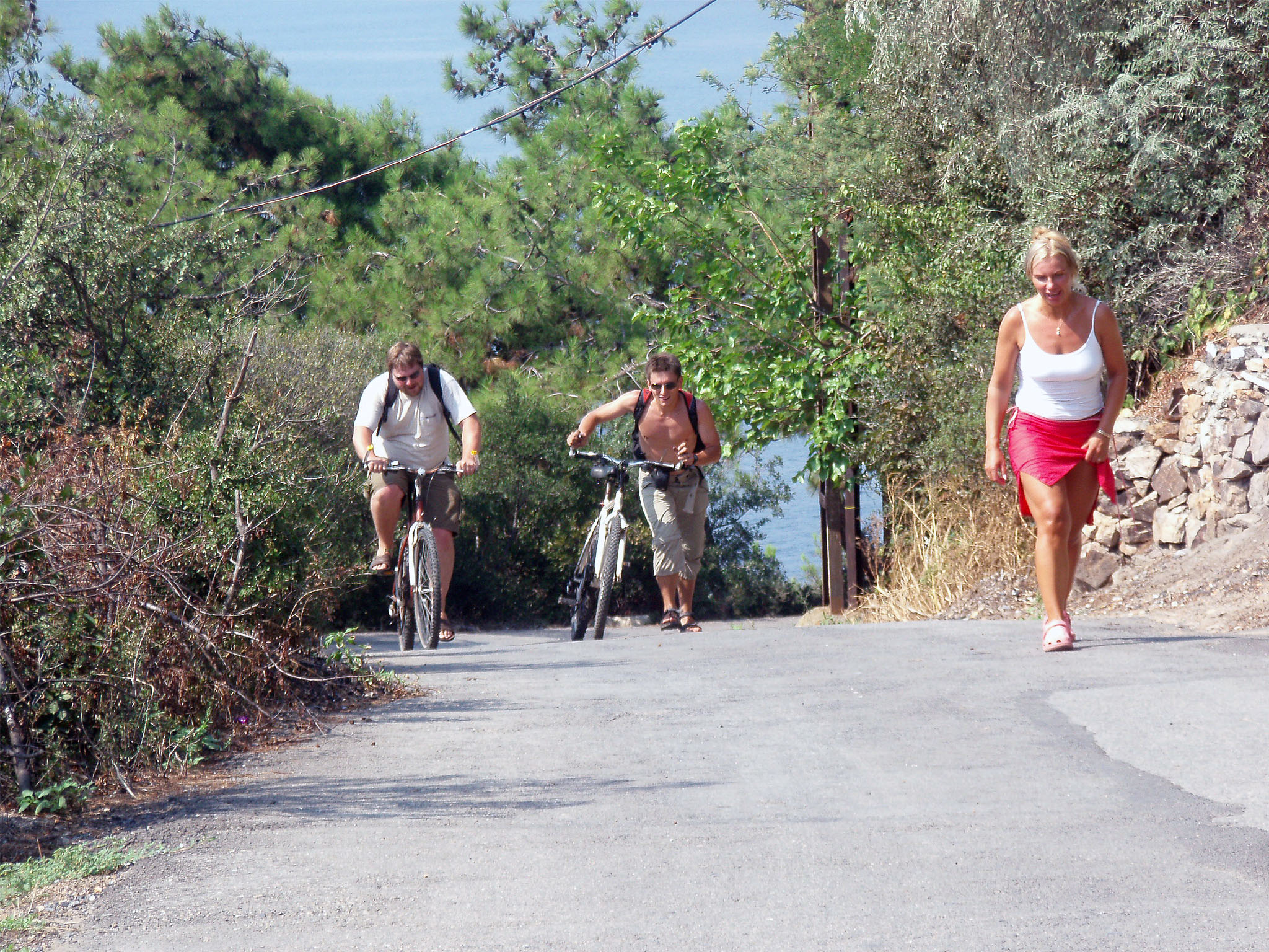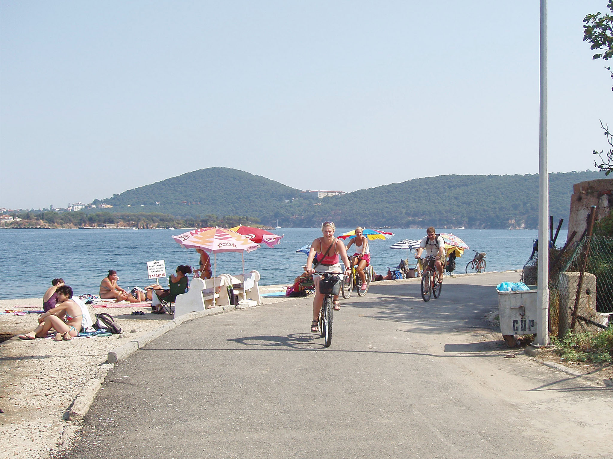 Laeval toimub usin kaubandustegevus, mehed käivad ringi ja müüvad jooke ning rõngassaia, mida küll peamiselt laeva taga parvena lendavate kajakate toitmiseks ostetakse. Kajakad lendavad õnneks laeva taga, mitte kohal :). Maha läheme kolmandas peatuses, mis meie arvates peaks olema Heybeli. Raamatute järgi pidi selle saare põhja- ja läänekaldad eriti ilusad olema. Pärast selgub, et oleme siiski üks peatus varem maha tulnud ja see saar ei ole mitte Heybeli. Aga mis siis. Otsime jalgrattalaenutust. Leiame mingi töökoja, mille ees kahtlase välimusega rattad on, mida laenutab Robinsoni välimusega mees. Robinson ei ole eriti jutukas ja näitab, et hind on 3 eurot tund. Mitte just väga odav, arvestades laenutavate jalgrataste seisundit. Heiti valib välja enam-vähem töötavad rattad. Muideks saartel laenutatavatel jalgratastel ei ole üldse esimest käiguvahetajat, või see ei tööta üldse ning kett jookseb kõige väiksema hammasratta peal aga suuremat pole siin vajagi.