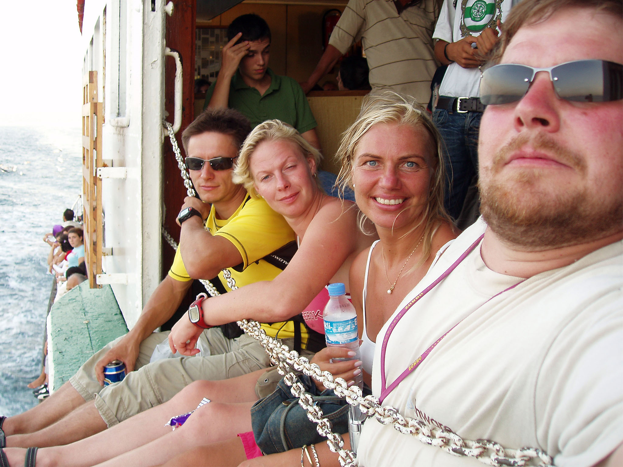 Meie oleme kiired õnnestub saada istekoht väljas. Pärast selgub küll, et see tähendab istekohta suitsunurgas ... aga siin on igal pool suitsetajad ilmses eelisseisundis. Meie oleme nüüd ju Eestis juba teistmoodi harjunud :). Laeval näeme ka selle reisi esimesi ja ainukesi kaasmaalasi, tervitame ja jagame muljeid. Neid poisse näeme veel mõnel korral ja sõidame sama lennukiga veel tagasigi.