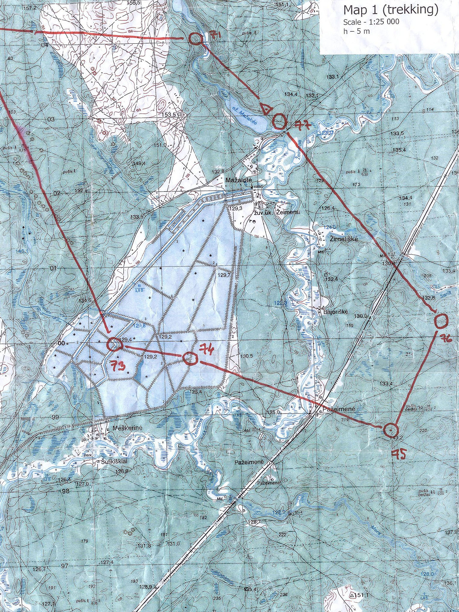 Alustame suhteliselt tempokalt, et võistlejate punti veidi laiali vedada. Selle tulemusena võtame esimese, CP71 (hill), esimestena, järgnevad võistkonnad on juba nägemisulatusest väljas. Teise kontrollpunkti on umbes 3 kilomeetrit, sellest pool üle suure liivavälja. Pärast liivavälja ületamist tekivad meil esimesed tõsised probleemid kaardist arusaamisega. viimaks kahtlustame, et oleme kaardist välja jooksnud ja nii kraamin seljakotist välja järgmise, jalgrattaetapi kaardi, mis on mastaabis 1:50 000 (hetkel kasutasime kaarti mastaabis 1:25 000). Avastame kaardilt sihikvartalite numbrid ja nende abil õnnestub meil lõpuks oma asukoht määrata – oleme tõepoolest kaardilt väljas ja jooksnud punktist mööda umbes 2.5 kilomeetrit! Punkti võtame vist suhteliselt viimaste hulgas. Kolmas ja neljas punkt asuvad mingisuguste täiskasvanud tiikide vahelistel tammidel, mis on võsa, kõrget heina ja sügavaid auke, millesse nii mõnedki korrad sisse kukume. Saame nendel etappidel mööda nii mõnestki võistkonnast, kaasa arvatud PERAKÜLA KRUPP JSK – jah, ka naiskonnad on meist eespool :).